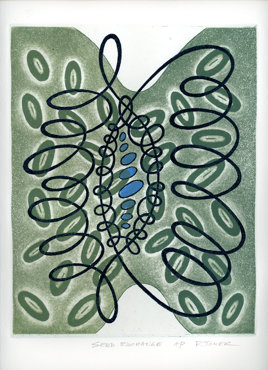 This invitational exhibition brings together the unusual forms and inventions that flourish in the outpourings of etchings, drawings, collages of Rochelle Toner, and similarly, in the etchings, screen prints, cut and sewn works of Lauren Kussro.   Both create imaginative worlds and forms that seem to grow from streams of impulse and inspiration, from nature, beauty, abundance, and evolutionary change. Toner’s abstractions grow from her mature visual voice, honed throughout a productive career as an educator and artist in Philadelphia.    Kussro, working in Houston, is an emerging artist and a new force that explodes the print form and questions the “how and where” printing can happen. Both artists exhibit a graphic instinct and naturally address “why to print” that bridges generations.