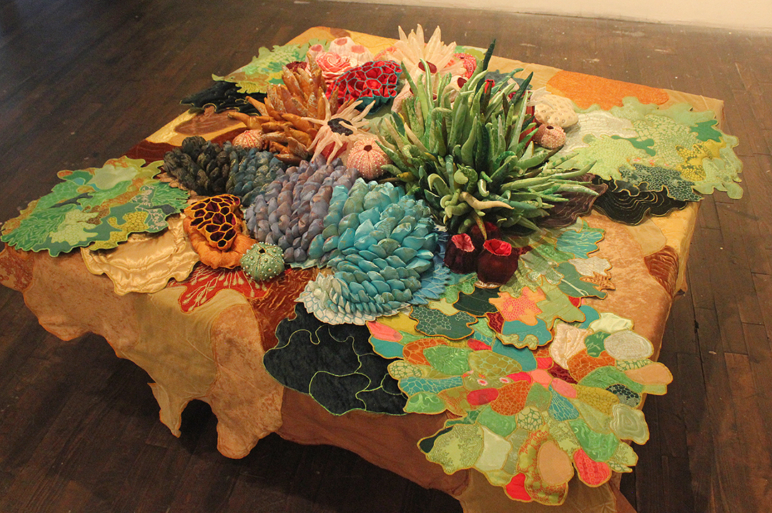 Images by Kussro:  left:  Lush Tangle, intaglio & thread;  right:  Reef, screenprint, thread, beads