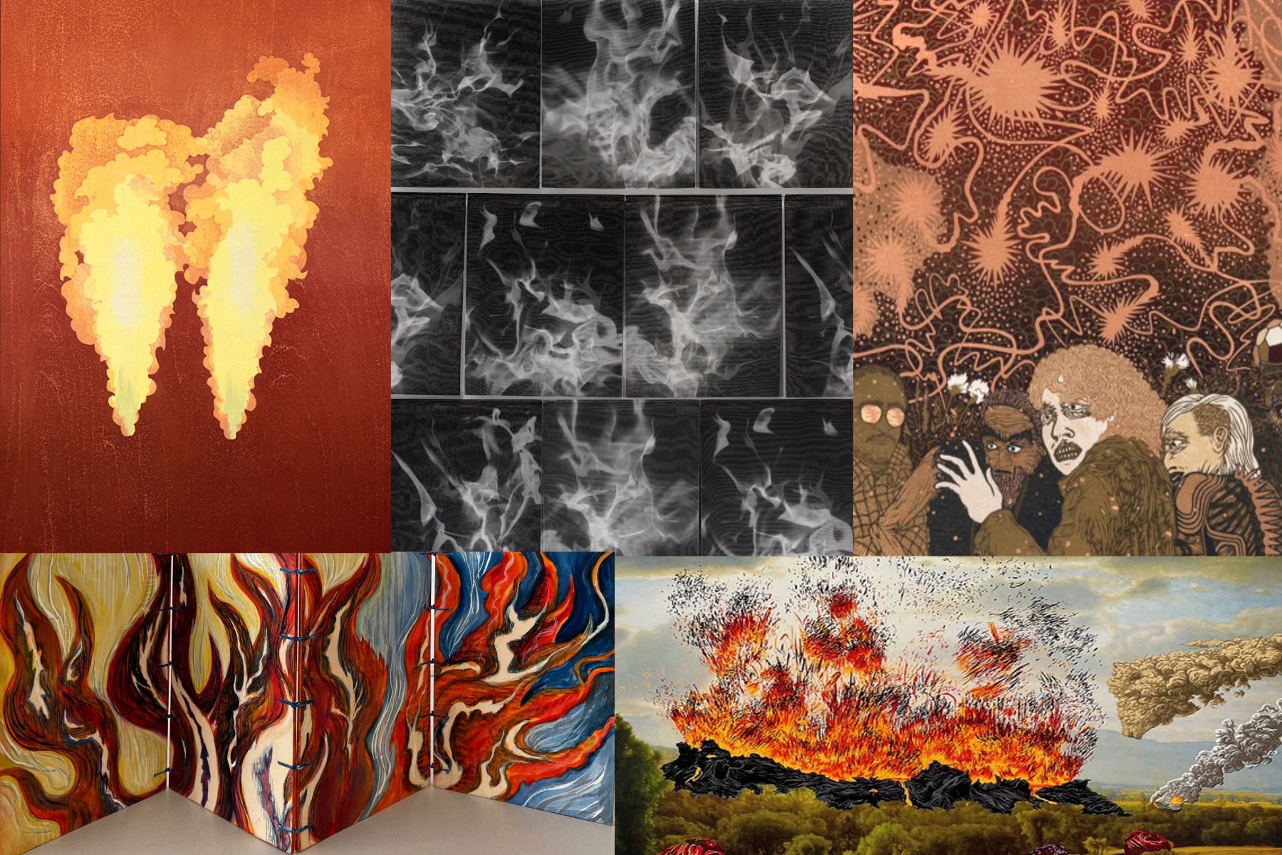 The topic of FIRE is sensitive and powerful in light of the everyday news of natural or human caused disasters. Fire with its heat and energy is a necessity of life on earth, useful and dangerous. These exhibiting artists intend to capture the essence of this element and its volatile shifting visual qualities in their art, suggesting layers of meaning and associations. The artworks depict captured moments of material consumption, a reverence for presence/absence/memory, and offer reference to various rituals and fantasies across culture, science, history.