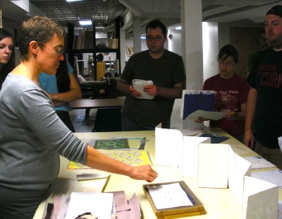 Papermaker Helen Hiebert was here for a watermarking workshop with UNL students in the papermaking studio. We learned interesting techniques and refined our skills for pulp preparation and sheet forming. She presented a great variety of samples that inspired intricate designs for the transmission of light through the paper as a watermark, due to the different thickness of the paper. Very beautiful results!