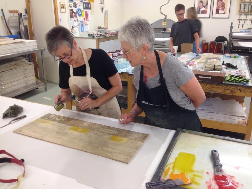 This week I taught the Japanese  Mokuhanga watercolor woodblock printmaking method, and we all learned to balance the nuances of Ink, Water, Wood – how the paper held the color, the pressure from the baren, fine tuning our wood carving skills, and sharing space and success.