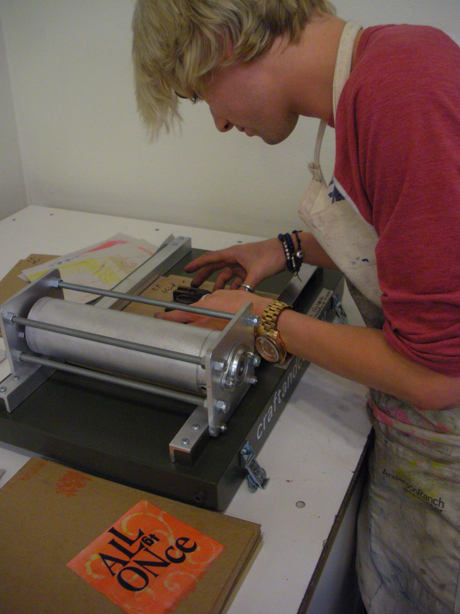The first week of August was beautiful in the Colorado mountains, where I was hosted at Anderson Ranch.   My workshop on Text & Image to Book was very experimental with mixed print media and approaches.   Presses were humming for woodcuts and collagraphs, along with movable type on the backpack SCOPE press.    Beautiful books were made by everyone, expanding and gathering pages of stories, tributes, textures, word play.