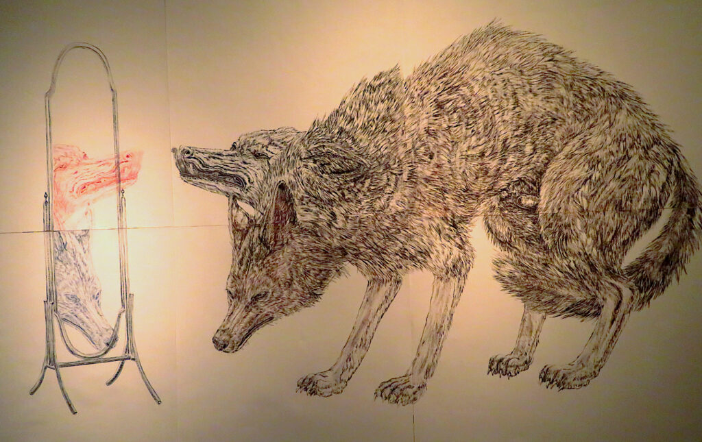 The artist states: “Even the animal subjects of my images are in performance for a human audience. Bare impressions on paper are a seemingly essential method of human-to-human communication– particularly when speaking through images of our animal peers to describe some aspect of ourselves, our society, where we fit in nature. The only truth that seems to reveal itself through our depiction of “the animal” is our self-awareness. A conceptualized and calculated portrayal of the “other” more so reflects and informs one’s portrayal of the self. Our symbolic descriptions of the world become a one-sided conversation- a mirror of one’s condition, and a possible beacon to our peers or “the other.” In the search for definition in our surroundings, through the drawing of the “creature,” we give off an unknowing longing, a signal of desire for communion, comfort, solace. An unspoken, less-humored feeling that we must have been lacking for some time in an understanding that is essential to our being but no longer disclosed to us. We cannot be as easily informed about ourselves. The human condition is in no way objective. In my active visual exploration I–like most humans– am in a constant process of learning, realizing and developing myself through the practice of invoking that communion between myself and my most personally perceived portrayal of the “other.”
