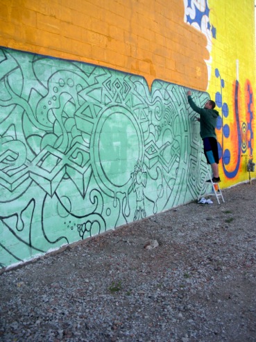 Also follow the first WallWorks temporary mural painting being made by Spencer Pacheco. He is starting this week, with impressive free-hand drawing to lay out the complex interlocking design. Then he plans to add intense color and dramatic graphic interplay. Spencer is a UNL art student, whose proposal was accepted for this visible exposure.