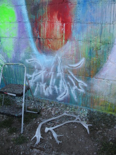 Lincoln artist Jeremy Johnson has executed his largest painting ever, and probably his first outdoor mural, created for Constellation Studios ongoing WallWorks public art project.  This new addition to brings painterly atmospheric abstraction, a sense of voids and spheres, gestural drips and tendrils.    We all watched in amazement as Jeremy responded each day to his stenciling props of sticks and antlers, his energetic layering with spray and brush, as he responds intuitively to the paint and the surrounding at large.   Many passers-by were interested and engaged in dialogue with this intelligent and driven artist.   Jeremy holds an MFA from the University of Nebraska-Lincoln.