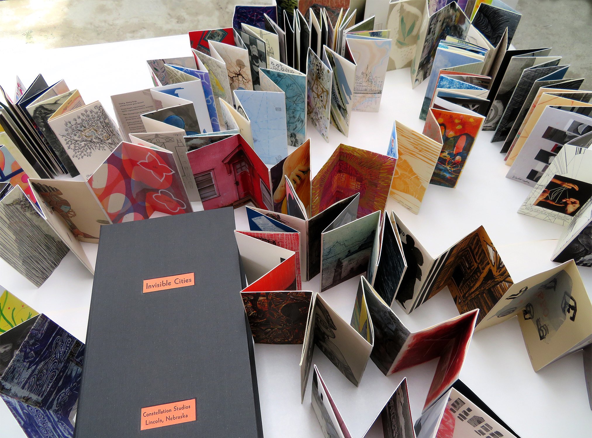 The Invisible Cities Book Project was initiated through an open call to artists, who were invited and inspired to contribute a book page in the specific size of 8 inches x 8 inches (20cm x 20cm) that were then joined together in an accordion-fold leporello structure. Participants include 238 artists, from students, to amateur and professional, with local artists from Lincoln Public Schools, UNL, Doane University, Nebraska Wesleyan, and from across the USA. International participants sent works from Italy, France, Finland, Bangladesh, New Zealand, United Kingdom, Japan, Poland, India, Croatia, Canada, Egypt, Argentina, Chile. The works are in a variety of media, including prints, photos, digital prints, watercolor, collage, and drawing. Invisible Cities is bound and housed in a clamshell box, and opens to 80 feet (24 meters).