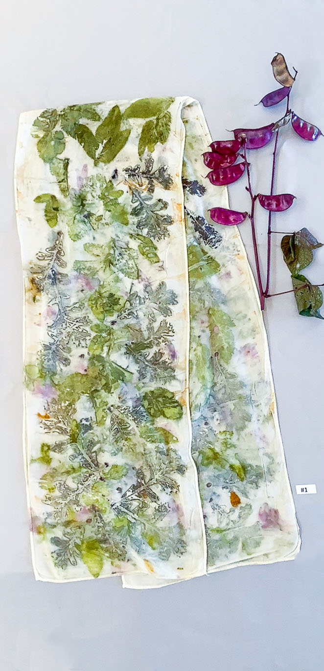 Approximately 8″ x 58″. Impressions from leaves and flowers leaving natural dye. 100% silk.