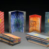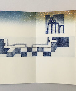 Etching, woodcut and letterpress on various Japanese Nishinouchi papers, and artist-made blue kozo. 16 pages.   Accordion folded and housed in a folder of covered  boards.